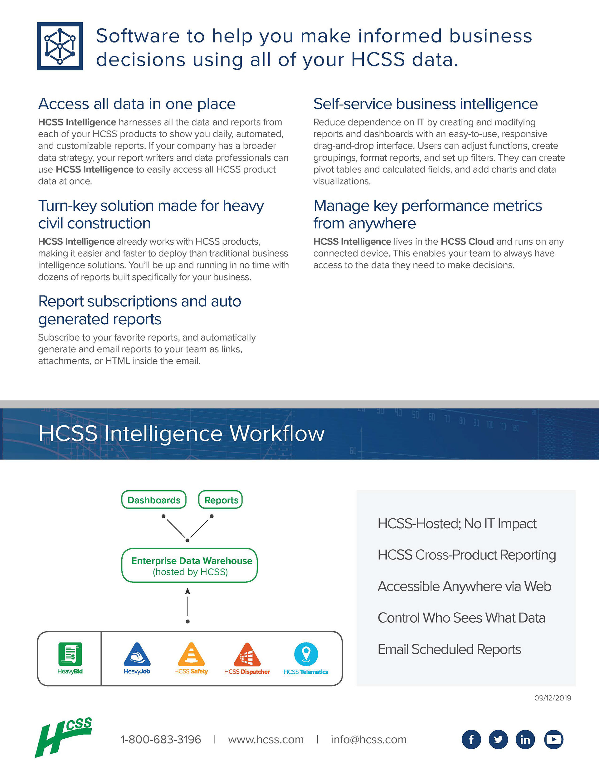 A document to help sales team discuss a new product that pulled data from multiple HCSS products into a dashboard with generated reports, charts, graphs, and forecasts. This sales sheet was used in both printed and digital formats, focused toward current HCSS software users.